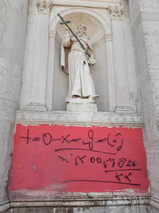 Sopra la facciata sono state tracciate alcune scritte apparentemente senza senso, somiglianti a equazioni matematiche.