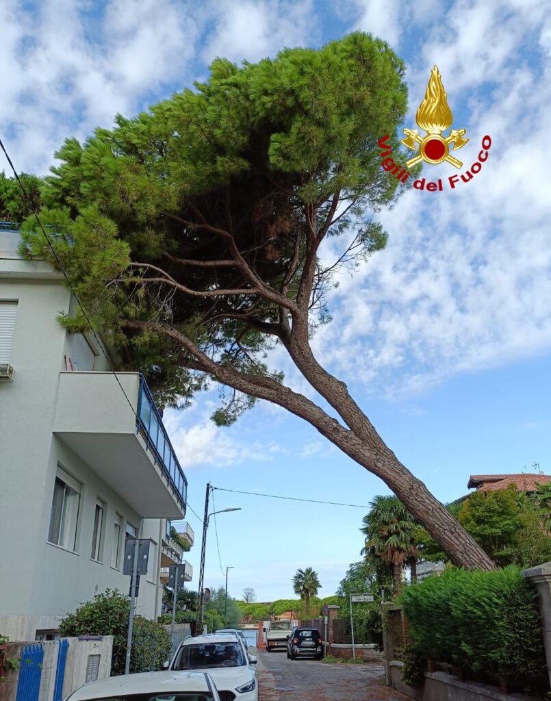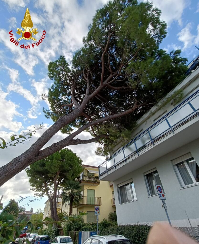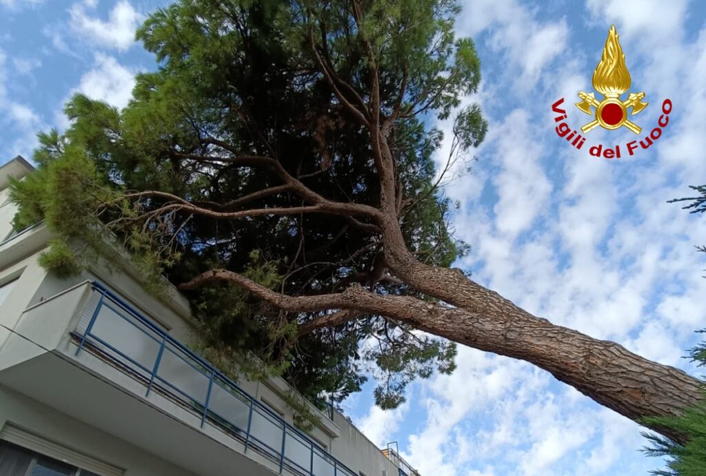 Pino marittimo di oltre 20 metri piegato dalla forza del vento finisce su un condominio