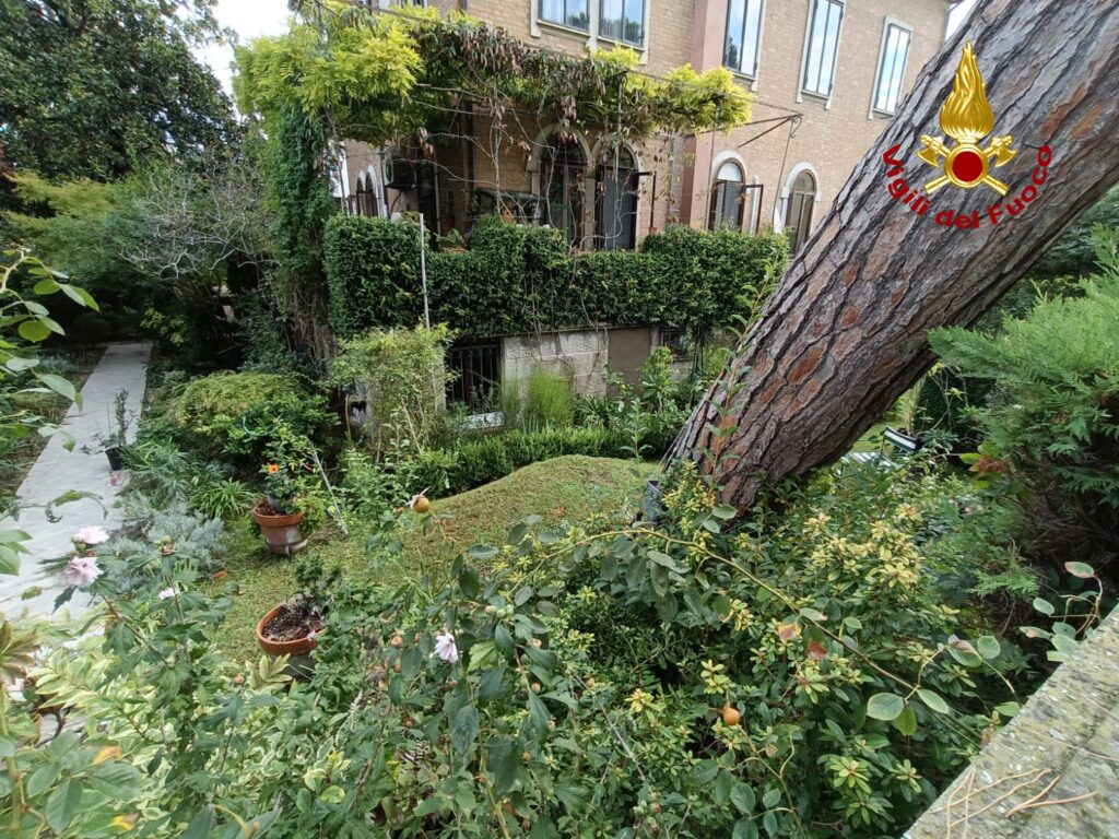 I vigili del fuoco stanno lavorando con l’ausilio dell’autoscala per effettuare il sramamento, il taglio e la rimozione del pino. L’operazione è complessa e richiede precisione, dato il posizionamento dell'albero e il rischio potenziale per le strutture e le persone presenti nelle vicinanze.