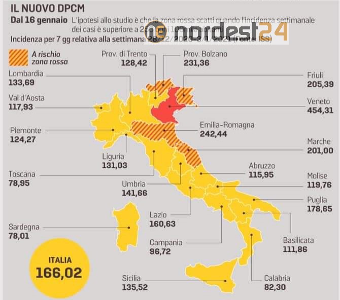 In base all'ultimo monitoraggio, con l'abbassamento dei parametri relativi all'incidenza dei casi, l'unica regione che andrebbe automaticamente in zona rossa sarebbe il Veneto, che ieri aveva un'incidenza a sette giorni di 454,31 casi per 100mila abitanti.
