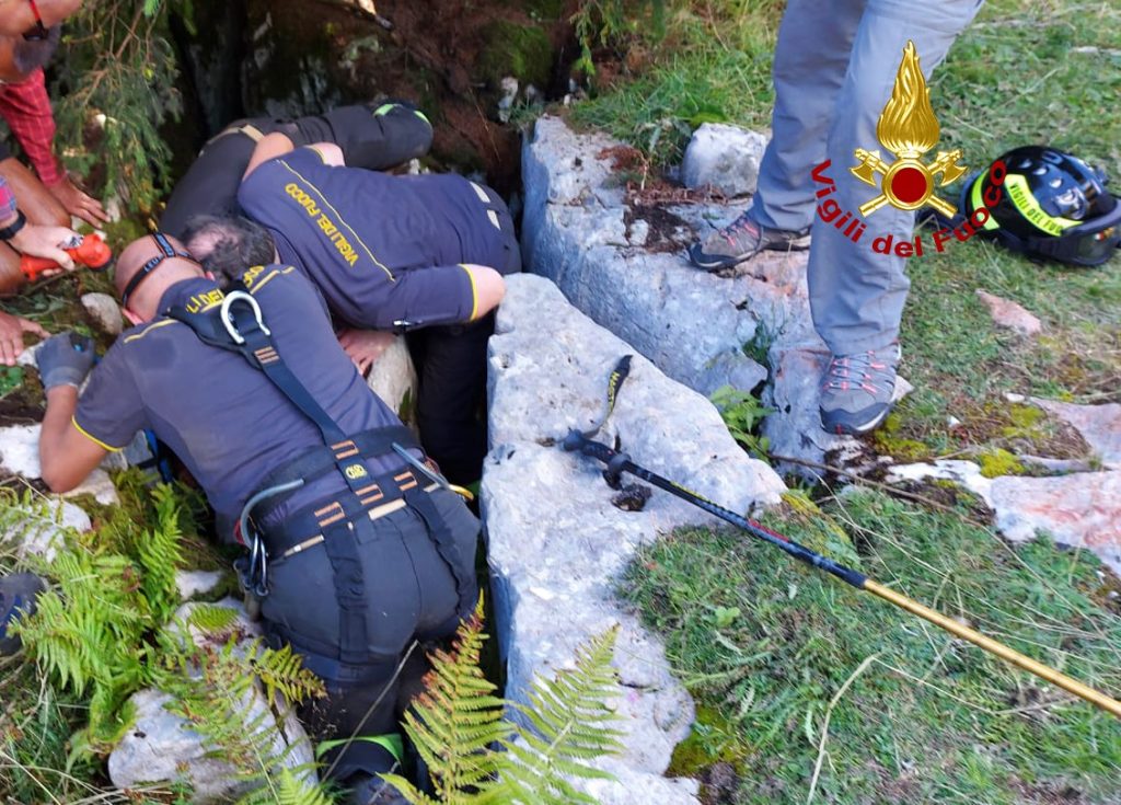 È stato quindi chiesto alla centrale di Vicenza di provvedere a l’invio sul posto di un gruppo elettrogeno e un demolitore. Nel frattempo con un piccone e dei pali i componenti della squadra sono riusciti in un punto laterale più largo a rimuovere un masso, ottenendo l’apertura di uno stretto varco, dove un vigile del fuoco dalla corporatura magra è riuscito, strisciando ad entrare.