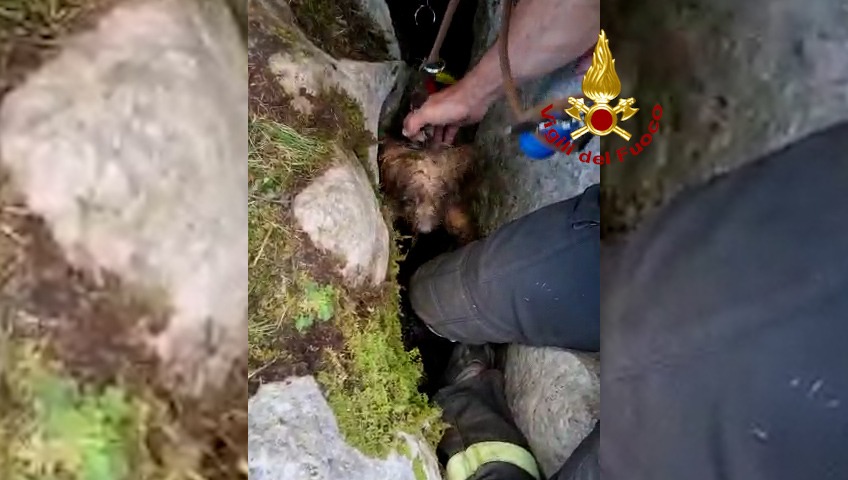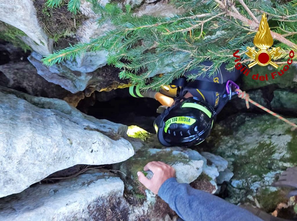 La squadra del personale dei pompieri di Asiago arrivati sul posto a piedi con un’attrezzatura di base, si sono subito prodigati per salvare lo yorkshire, che era tuttavia irraggiungibile, se non demolendo la pietra.